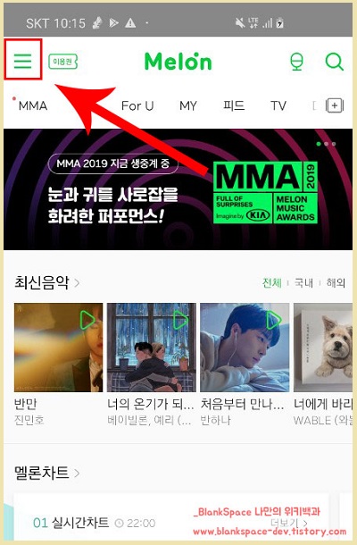 먼저, 멜론 앱을 실행하면 아래와 같이 메인화면이 나옵니다.