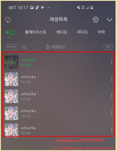 이처럼, 같은 노래가 계속해서 재생목록에 포함되는 것입니다. 저의 경우에는 이처럼 같은 곡이 들어가는 게 싫더라고요.
