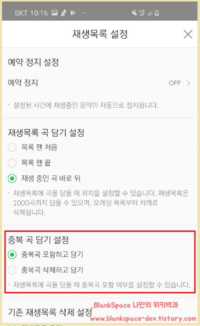 이번에 사용할 기능은 재생목록에 중복된 노래를 추가하지 않는 기능을 사용할 것이므로, 아래 보이시는 중복 곡 담기 설정만 집중하시면 되겠습니다.
