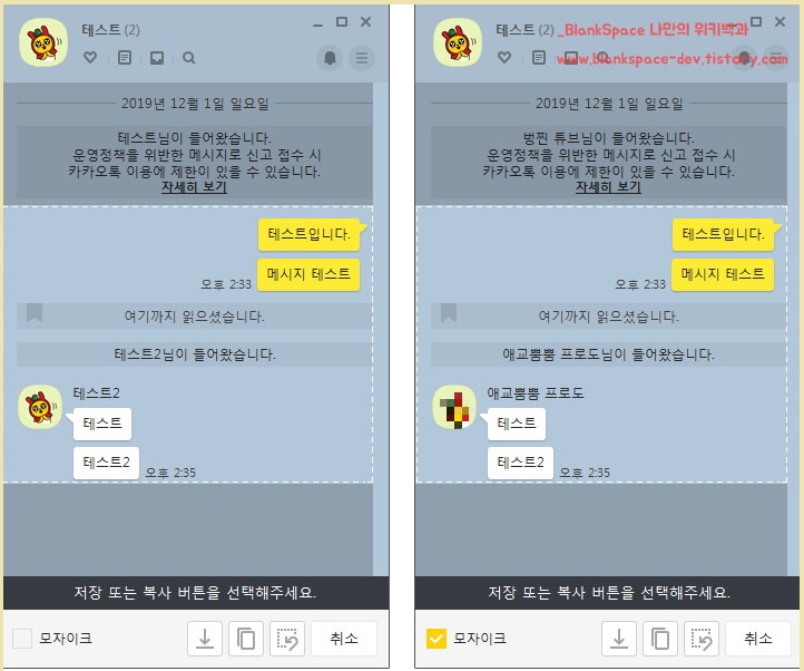 이때, 하단에 모자이크라는 것이 보이시죠? 이것을 누르시면, 채팅창에 참여한 사람들의 이름이 달라집니다.