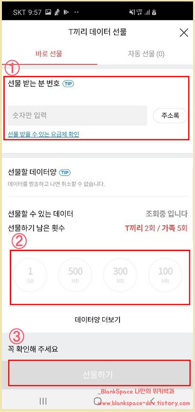 T끼리 데이터 선물을 누르면, 데이터 선물을 하기 위한 상대방 정보 및 전달할 데이터양을 설정해야 합니다.