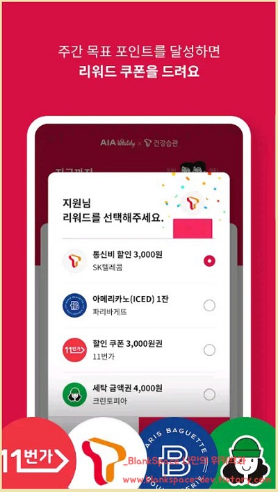 앱을 실행하기 전에, AIA 바이탈리티 앱에서는 주간 목표를 달성하면 아래와 같이 리워드 쿠폰을 줍니다.