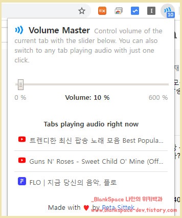 사실 탭마다 볼륨을 조절하는 것이 주목적이라 할 수 있고, 600%까지 볼륨을 높일 수 있다는 것은 추가 장점이라고 생각하시면 되겠습니다.