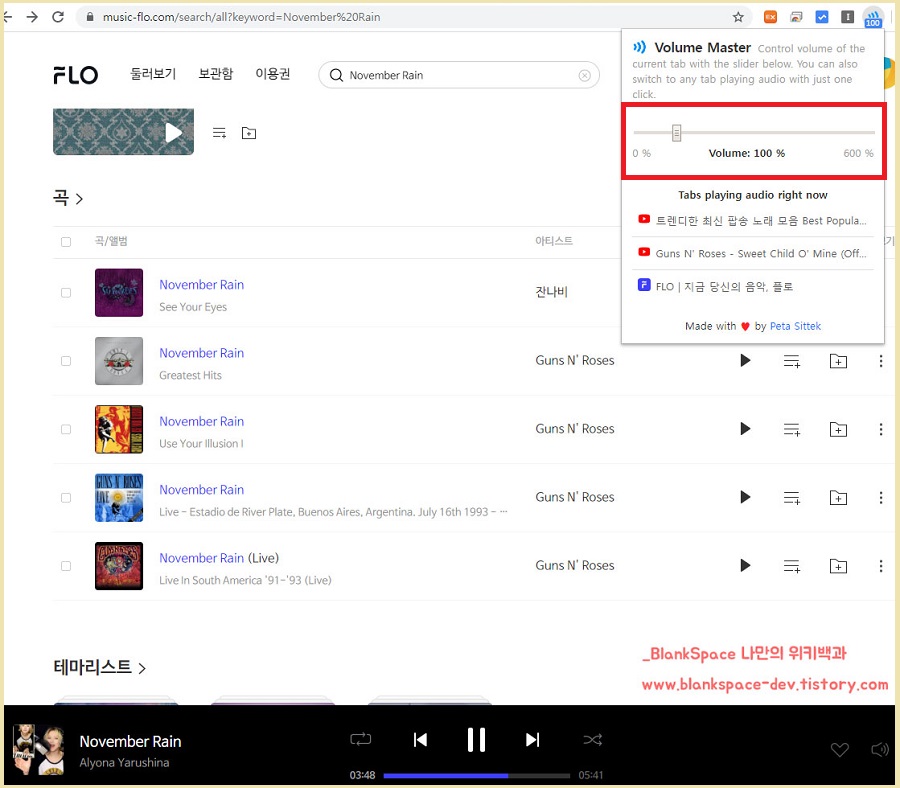 그 결과, FLO 사이트의 소리가 잘 들리고, 유튜브 영상의 소리는 잘 들리지 않았습니다. 즉, 제대로 실행되고 있었습니다.