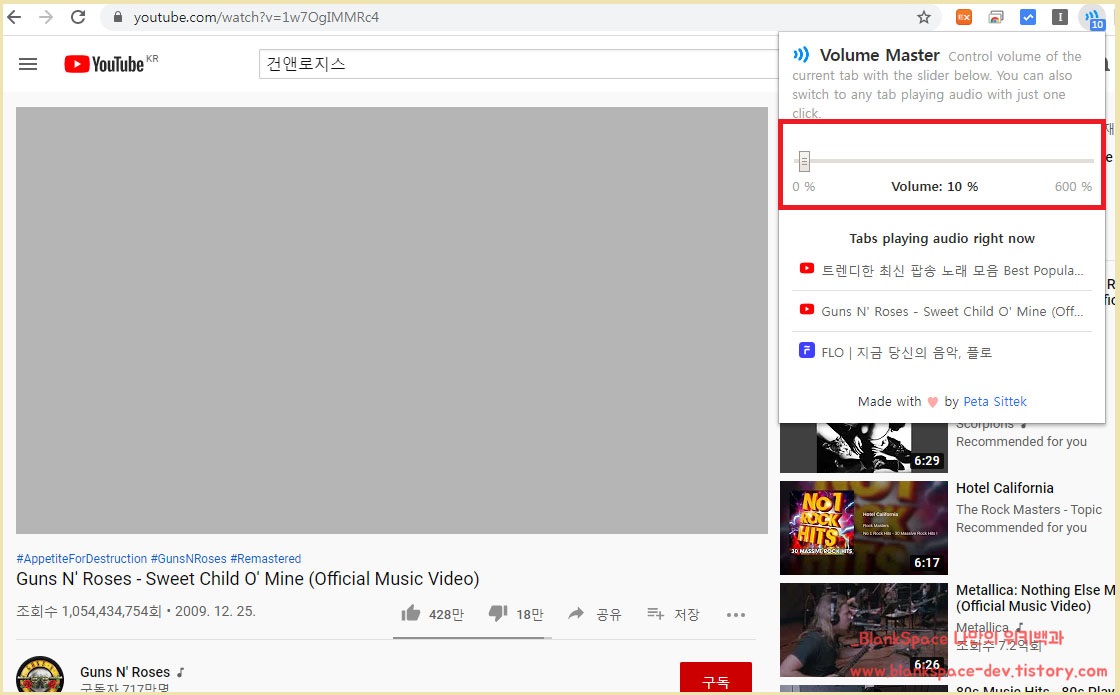 때문에, 탭 별로 볼륨 컨트롤러를 조절할 수 있는 방법이 있지 않을까라는 생각이 들더군요. 그래서, 크롬 브라우저 확장 프로그램에 관련 기능이 있을까라는 생각으로 찾아 보았습니다. 그 결과, 탭 별로 볼륨 컨트롤러를 조절할 수 있는 확장 프로그램은 있었습니다.