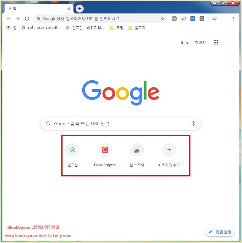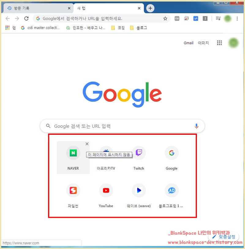 보통, 크롬 브라우저를 처음 실행하거나 새로운 탭을 열 때마다, 아래와 같은 페이지를 볼 수 있습니다. 위에서 말한 것처럼 이번 포스팅에서는 아래 빨간 네모 상자 부분을 설정하는 방법에 대해 자세하게 설명하도록 하겠습니다.