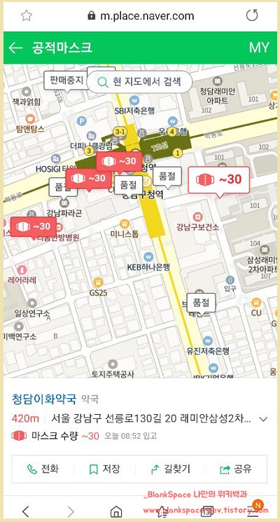 지도에서 말풍선을 누르면, 해당 약국의 이름과 같은 상세 정보도 확인할 수 있으니, 마스크를 사기 전에 위치를 확인해두시는 것도 좋을 것 같습니다. 조금만 지체해도 아래처럼 품절인 약국이 속출하니 말입니다.