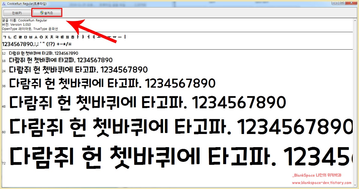 위에 폰트 파일을 실행하면, 아래처럼 창이 열립니다.