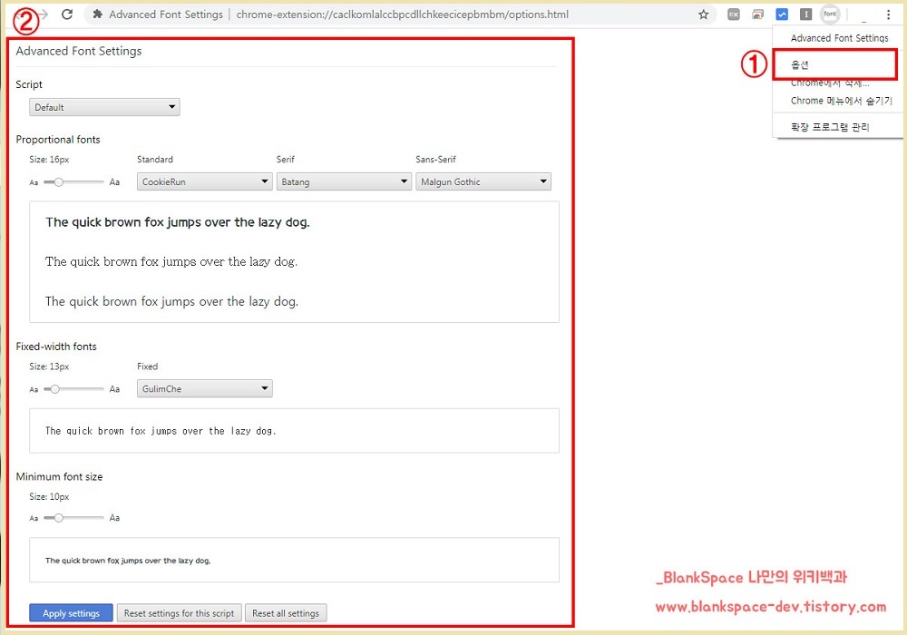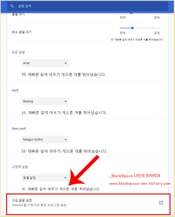 그럼 아래 Advanced Font Settings 페이지가 열립니다. 이전에 크롬에서 기본으로 제공하는 글꼴보다는 조금 더(?) 세세합니다.