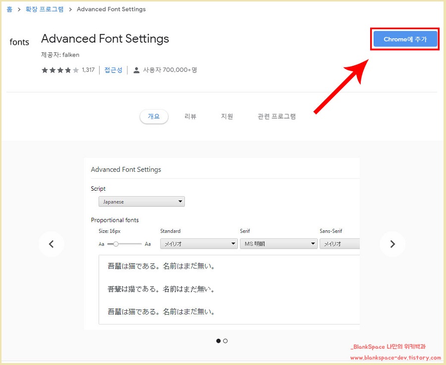 아래처럼 확장 프로그램 Advanced Font Settings 탭이 실행될 거예요. 오른쪽에 보이는 Chrome에 추가 버튼을 눌러주세요.
