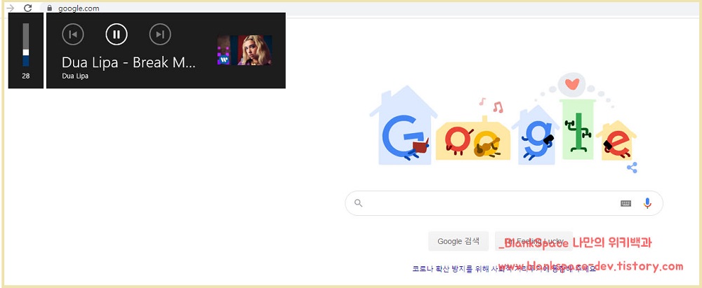 바로, 동영상이나 음악 소리를 조절할 때에 나오는 볼륨 조절 창이었습니다. 저는 키보드로 소리 조절이 가능하거든요. 여느 때처럼, 키보드로 소리를 조절하다보니 뭔가 이상한 창이 나오더라고요. 그래서 찾아보니, 크롬에서 추가한 기능이더군요.