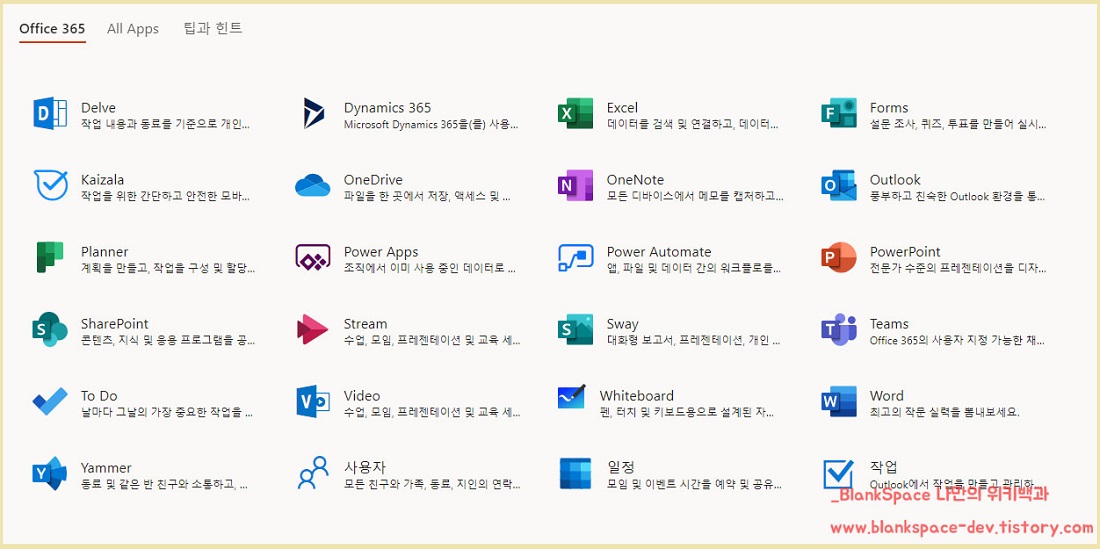 제가 사용 중인 Office 365를 보시면 아래와 같습니다. 굉장히 많은 앱을 제공하고 있죠? 물론, 저처럼 사무 작업이 별 필요가 없는 사람에게는 사치스러운(?) 앱들이 많긴 합니다. 하지만, 아래 앱들이 필요한 사람이라면 Office 365도 사용해볼 만하다고 생각합니다.