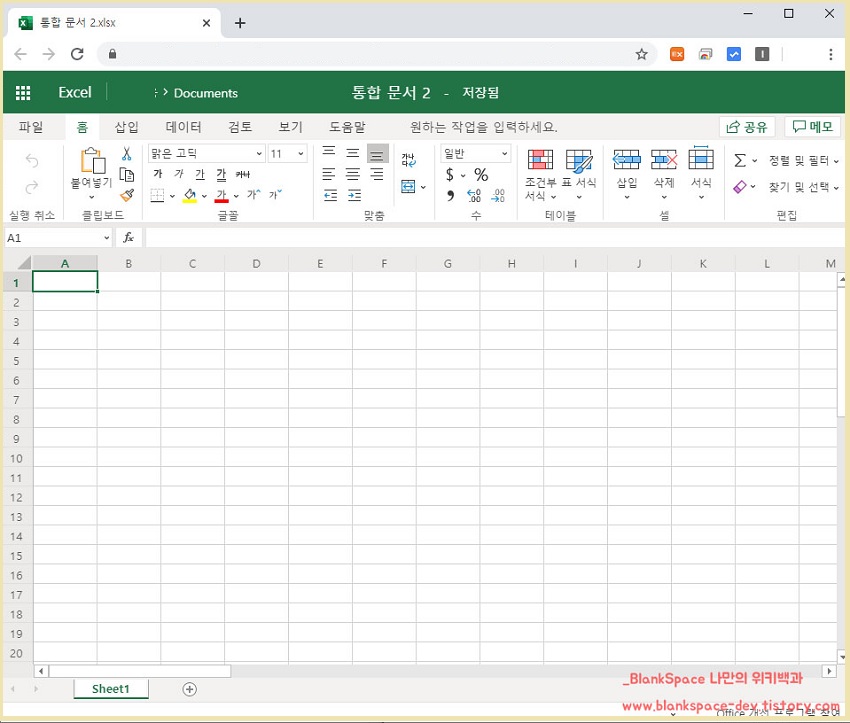 아래는 Office 365에서 Excel 프로그램을 실행하였을 때의 화면이에요. 아래처럼 웹 환경에서 Excel 작업을 할 수 있는 것을 볼 수 있죠? 참고하시면 좋을 것 같습니다.