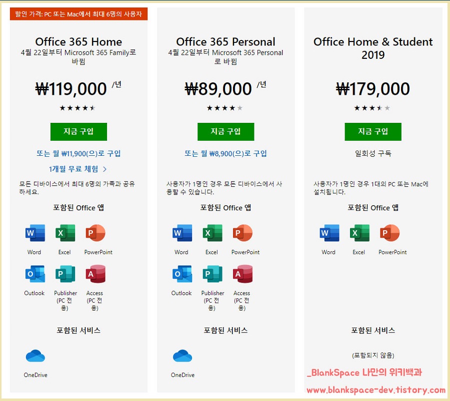 물론, Office 365가 비싼 이유도 있습니다. 보시면 포함된 Office 앱의 종류가 차이 나는 것을 확인할 수 있을 거예요.