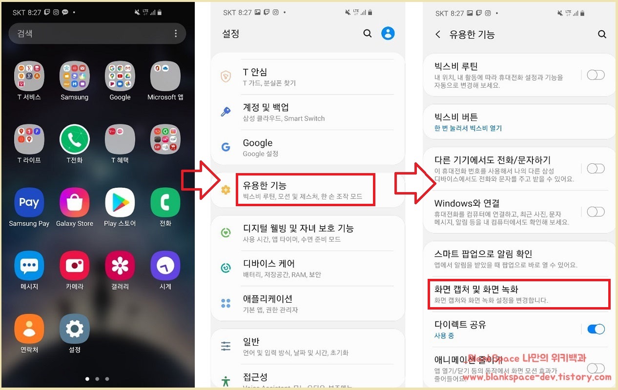 먼저, 설정을 눌러주세요. 그 후, 유용한 기능 -> 화면 캡처 및 화면 녹화 -> 화면 녹화 설정 순서대로 눌러주세요.