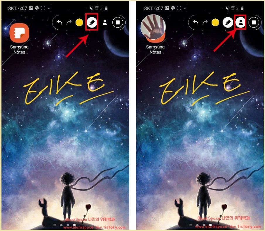먼저, 왼쪽 이미지를 보면, 화면에 필기를 할 수 있는 도구를 제공합니다. 연필 부분을 누르면, 화면에 원하는 글을 쓸 수 있습니다.