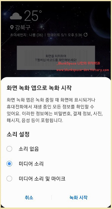 4. 화면 녹화를 누르면, 아래처럼 화면 녹화 앱으로 녹화 시작이라는 창이 표시될 거예요. 녹화를 할 때에 미디어 소리와 마이크 소리를 영상에 포함시킬지 선택을 해야 합니다.