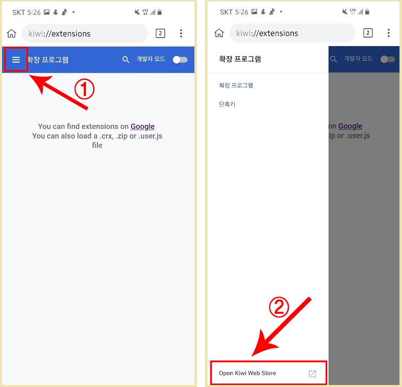 1. 키위 브라우저를 실행하면, 왼쪽 이미지처럼 표시될 거예요. 상단 오른편에 보이는 점 세 개 부분을 누르면, 오른쪽 이미지처럼 메뉴가 표시됩니다.