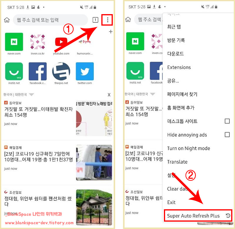 아래처럼 페이지 상단 오른쪽에 있는 점 세 개를 눌러서 메뉴를 띄워주세요. 그 후, 오른쪽 이미지처럼 메뉴 중에서 Super Auto Refresh Plus 부분이 보인다면 제대로 설치한 것입니다.