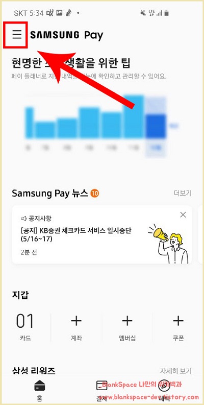 먼저, 삼성페이 앱을 실행하세요. 그럼, 아래처럼 삼성 페이의 기본 화면이 표시될 것입니다.