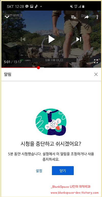 시청 중단 알림 시간을 5분으로 설정한 후에 영상을 봤습니다.