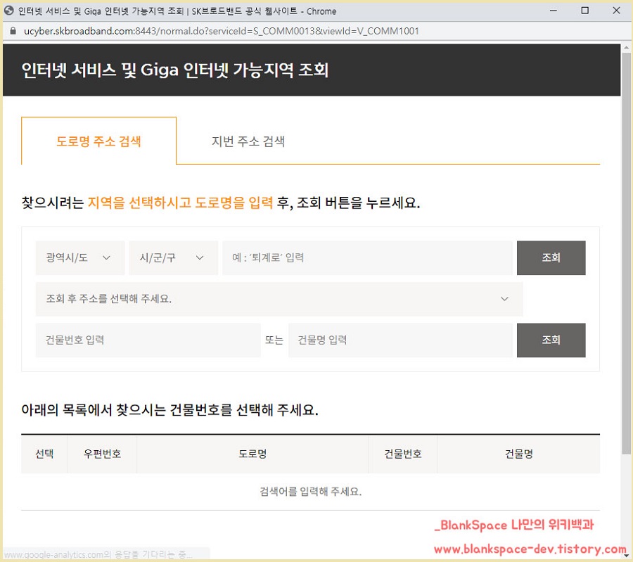 위에 이미지를 누르셨으면, 아래처럼 인터넷 서비스 및 Giga 인터넷 가능지역 조회라는 창이 뜹니다.