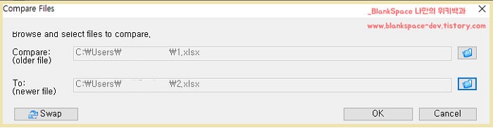 누르시면, 아래처럼 창 하나가 열릴 거예요. 이제, 이 창에서 Compare와 To 부분에 비교할 엑셀을 찾아서 넣어주시면 됩니다.