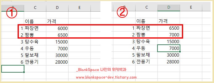 짜장면과 짬뽕 가격 부분이 표시되는 것이 보이시죠?