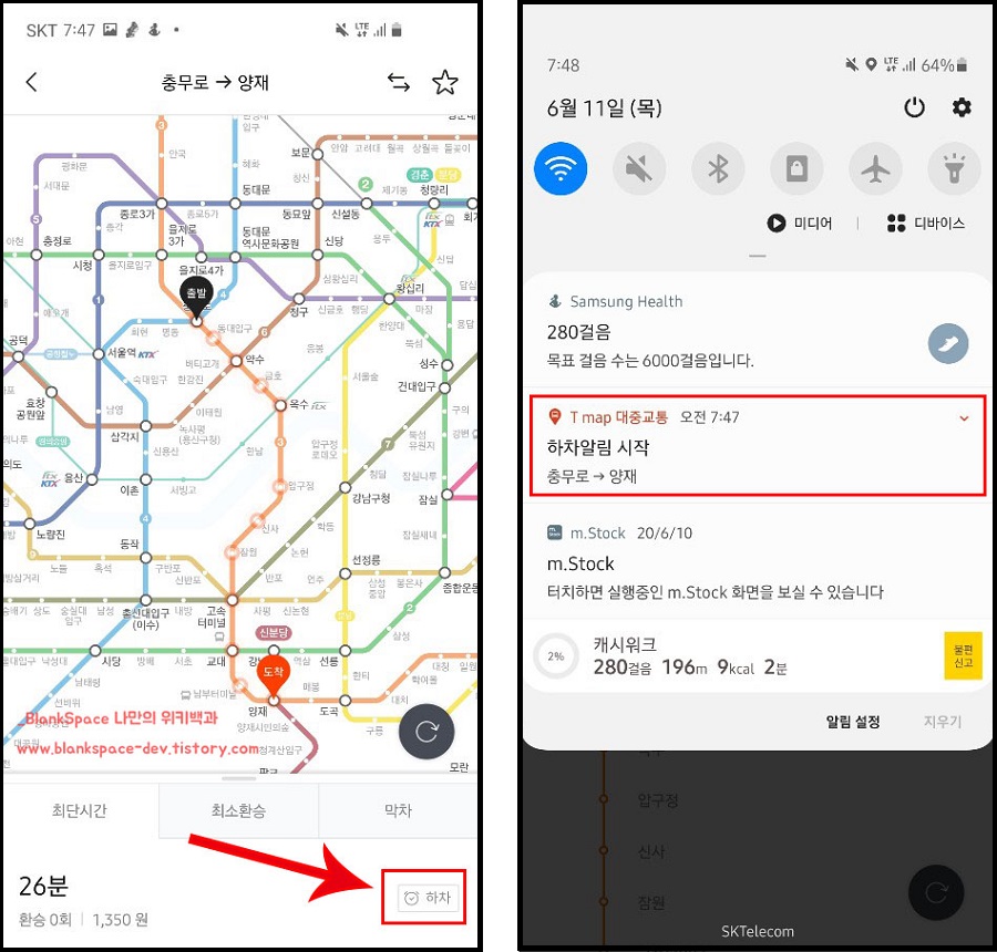 다음으로, 하차 알림이 필요 없다고 생각하신다면, 미리 설정을 끌 수도 있습니다. 그럴 경우에는 왼쪽 이미지에 알림 종료 버튼을 누르면 됩니다.