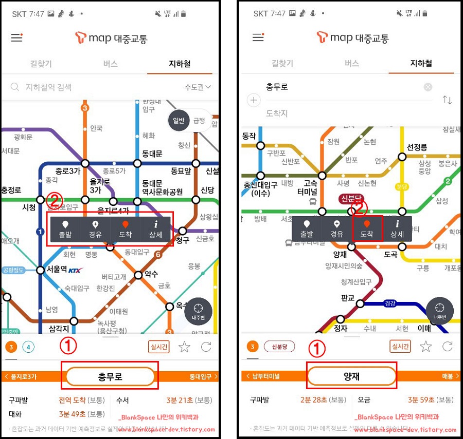 위에서 출발 / 도착 지점을 설정하셨다면, 아래 왼쪽 이미지처럼 지하철 역 지도에 표시가 될 거예요.