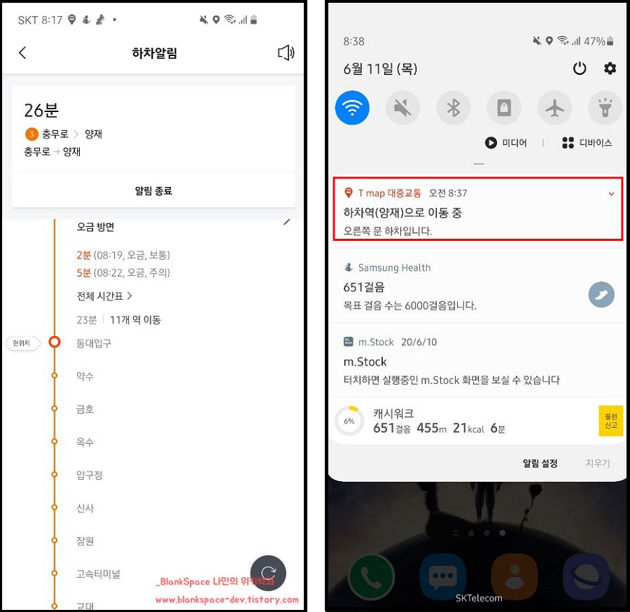 일단, 하차 지점은 제대로 동작하는 것을 확인하였습니다. 왼쪽 이미지처럼 동대입구 쪽에 도착하니, 현 위치가 제대로 바뀌더군요.