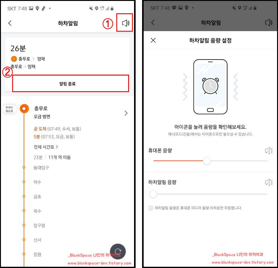 하차 알림 설정 중에 음량 설정과 알림 종료을 선택할 수 있는데요.