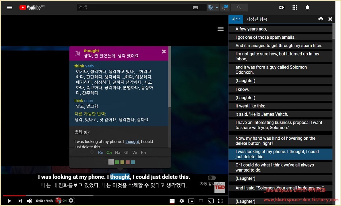 이로 인하여, 일일이 자막을 보다가 모르는 단어가 나오면, 구글에서 검색을 할 필요가 없어지게 됩니다. 그만큼 시간 절약도 되고요!