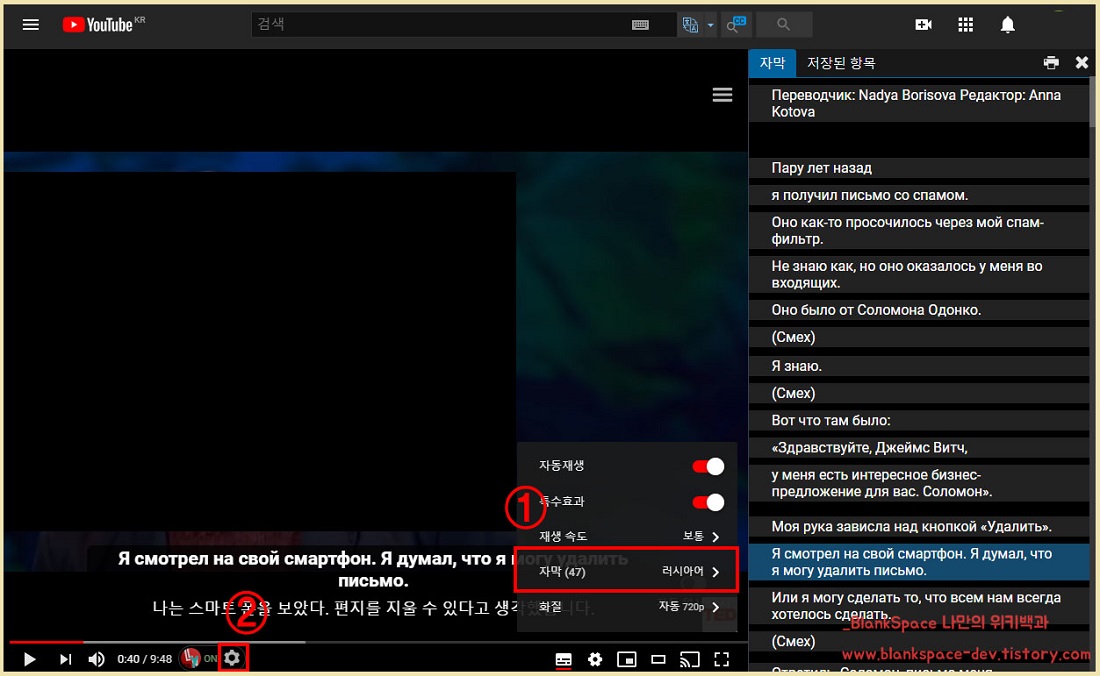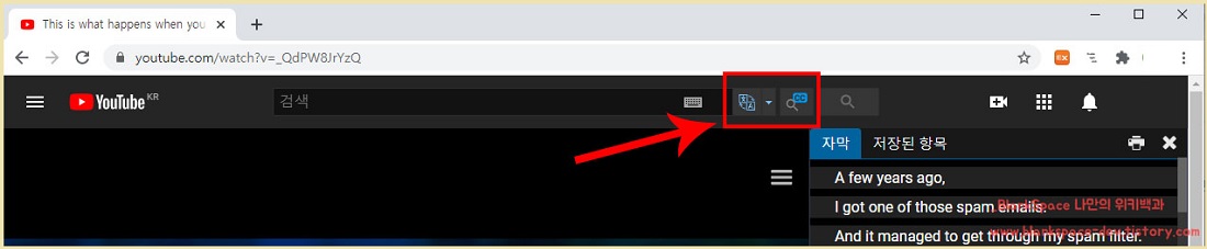 먼저, 유튜브 영상 중 외국 영상을 아무거나 실행해보세요. 아래처럼 화면 구성이 되어 있는 것을 확인할 수 있을 거예요.