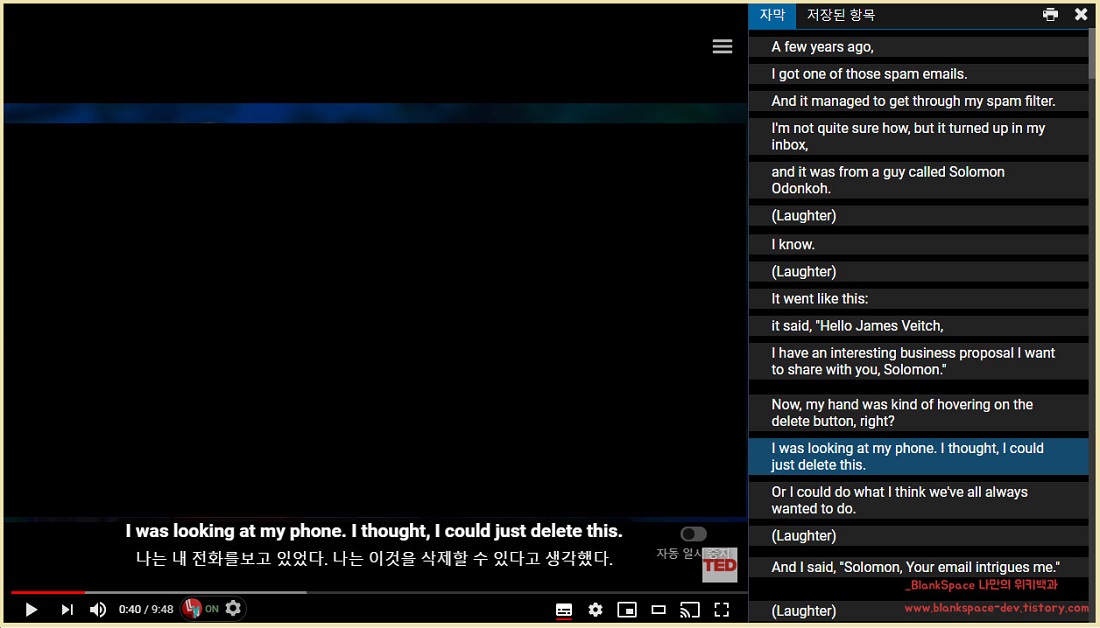 또한, 자막 타임라인이라고 했죠? 따라서 문장의 오른쪽 부분을 누르면, 해당 부분으로 영상 이동도 가능합니다! 영어나 외국어 쉐도잉 할 때 굉장히 편할 것으로 생각합니다.