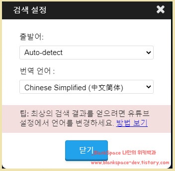 첫 번째 버튼은 검색을 할 때에 언어 설정입니다. 즉, 한국어로 검색한다면, 자동으로 번역되어 다른 나라 언어로 검색을 진행하는 것이죠.