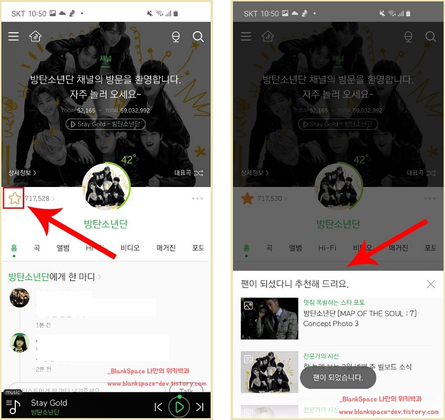 그럼, 오른쪽 이미지처럼 방탄소년단의 팬이 되었다는 메시지가 표시됩니다. 그럼, 해당 가수의 팬이 된 것입니다.