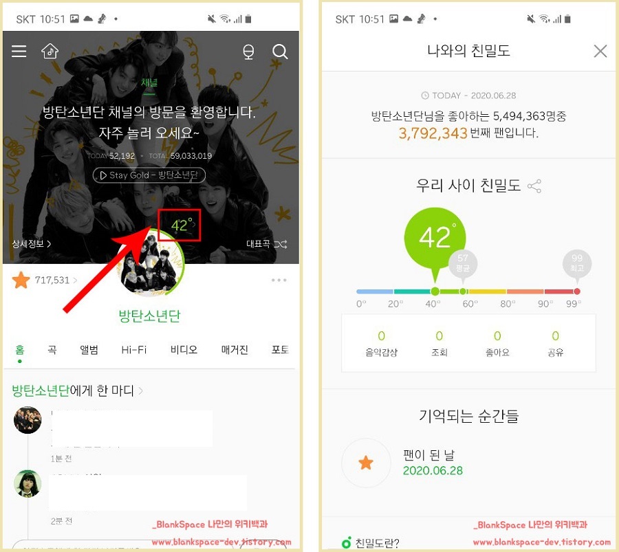 그럼, 오른쪽 이미지처럼 가수와 나의 친밀도가 표시됩니다. 이 친밀도는 해당 가수의 노래를 듣거나 여러 활동들을 하면 자동으로 올라가는 시스템입니다.