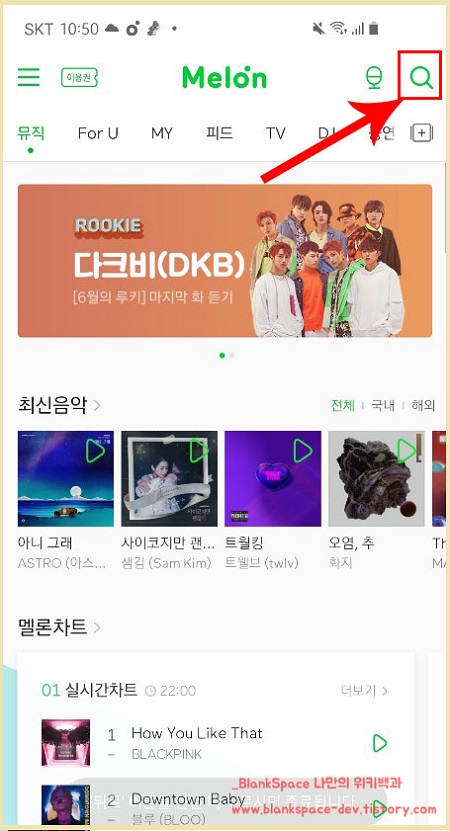 먼저, 멜론앱을 실행하시면, 상단 오른편에 보이는 돋보기 모양을 눌러주세요.