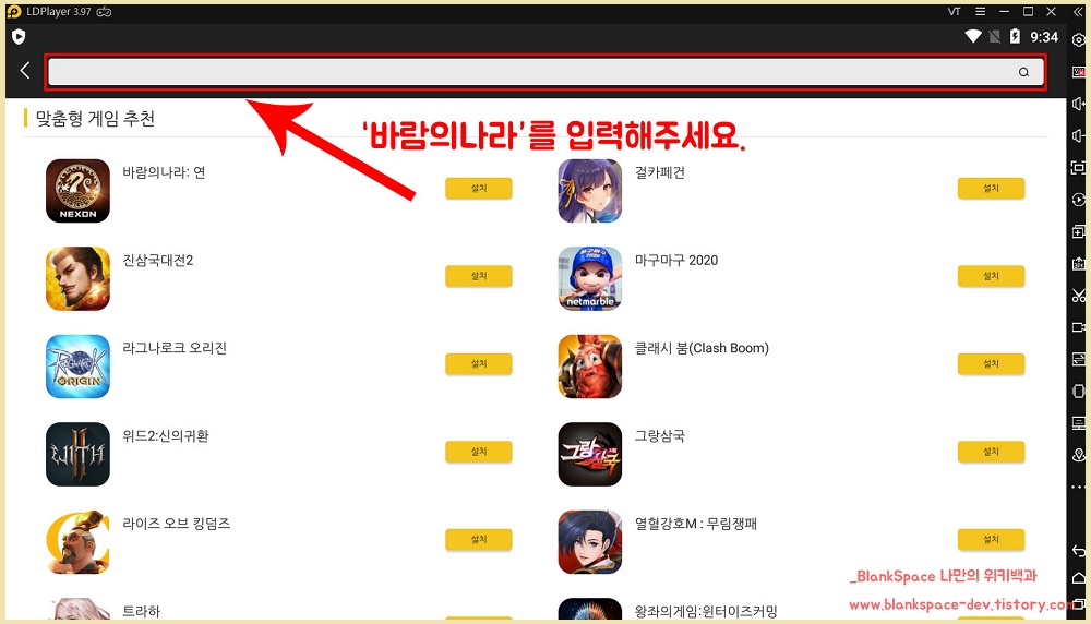 바람의나라: 연이 최근에 인기 있는 게임이라 아래 추천 화면에 보이는데, 만약 보이지 않는다면 검색창에 바람의나라를 입력하시면 됩니다.