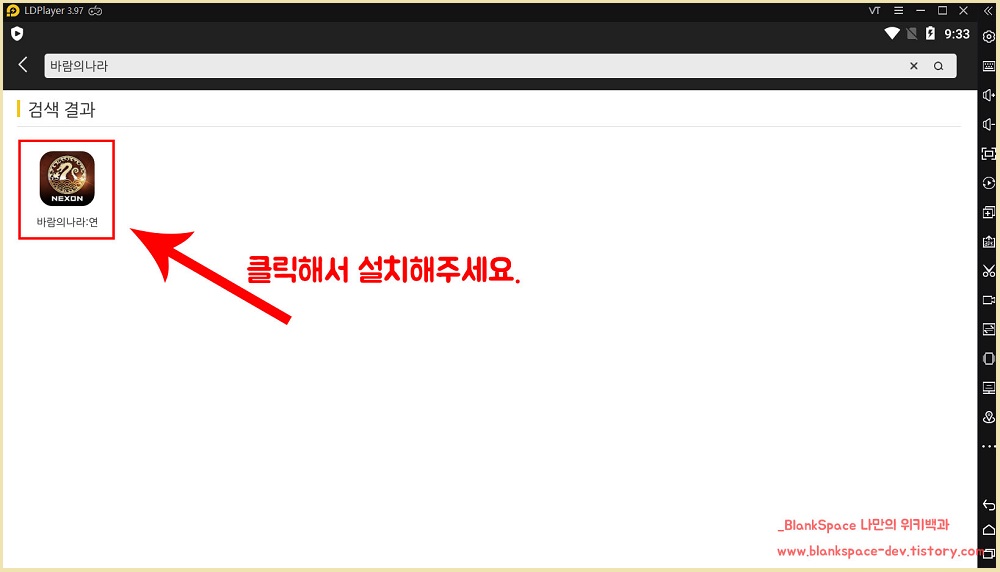 이제, 앱 플레이어 처음화면으로 다시 이동해주세요. 이후, 바람의 나라 게임 설치가 완료되었다면, 아이콘이 보이실거에요. 해당 아이콘을 눌러서 게임을 실행하시면 됩니다.