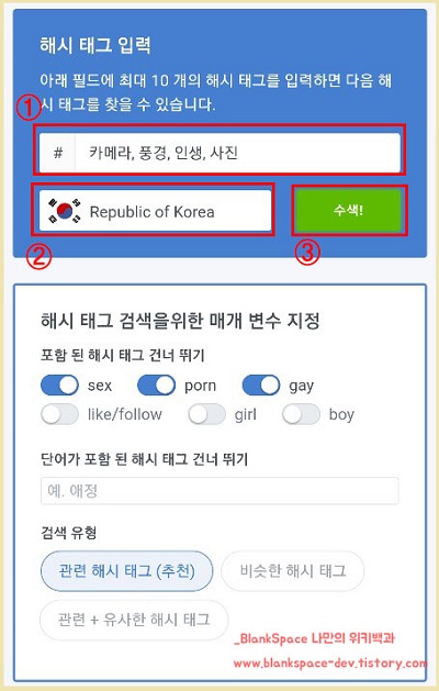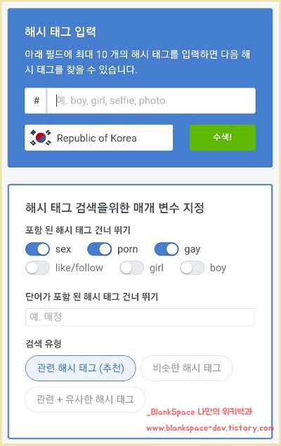혹시나, 해시 태그에서 이상한 문구가 포함되는 게 싫다고 하신다면, 아래 해시 태그 검색을 위한 매개 변수 지정 쪽에서 직접 설정하시면 되겠습니다.