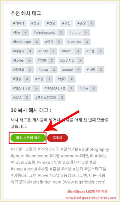 아무튼, 이제 해시 태그를 포스팅에 사용해봐야겠죠? 위 태그가 마음에 드셨다면, 아래 보이는 클립 보드에 복사 버튼을 눌러주세요.