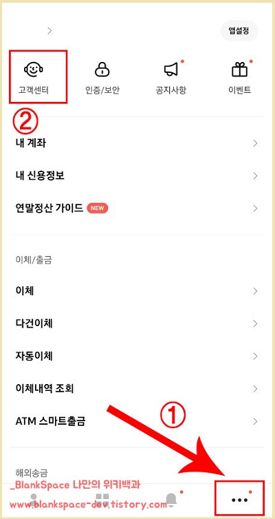 카카오 뱅크 앱을 설치한 후, 아래처럼 하단에 점 세 개 부분을 눌러주세요.