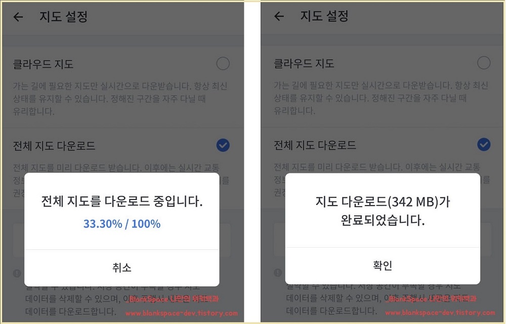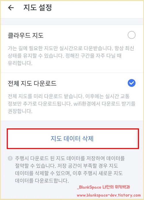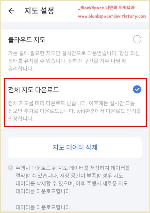 전체 지도 다운로드는 미리 전체 지도를 다운로드 받는 것을 말합니다. 이후에는 실시간 교통 정보에 대한 내용만 다운로드됩니다. 즉, 클라우드 지도보다는 상대적으로 데이터 사용이 줄겠죠?