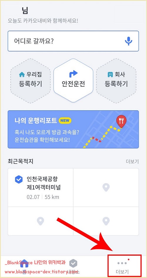 아래처럼 카카오내비를 실행하면 첫 화면이 표시될 거예요. 하단 오른쪽에 보이는 더보기 탭을 눌러주세요.
