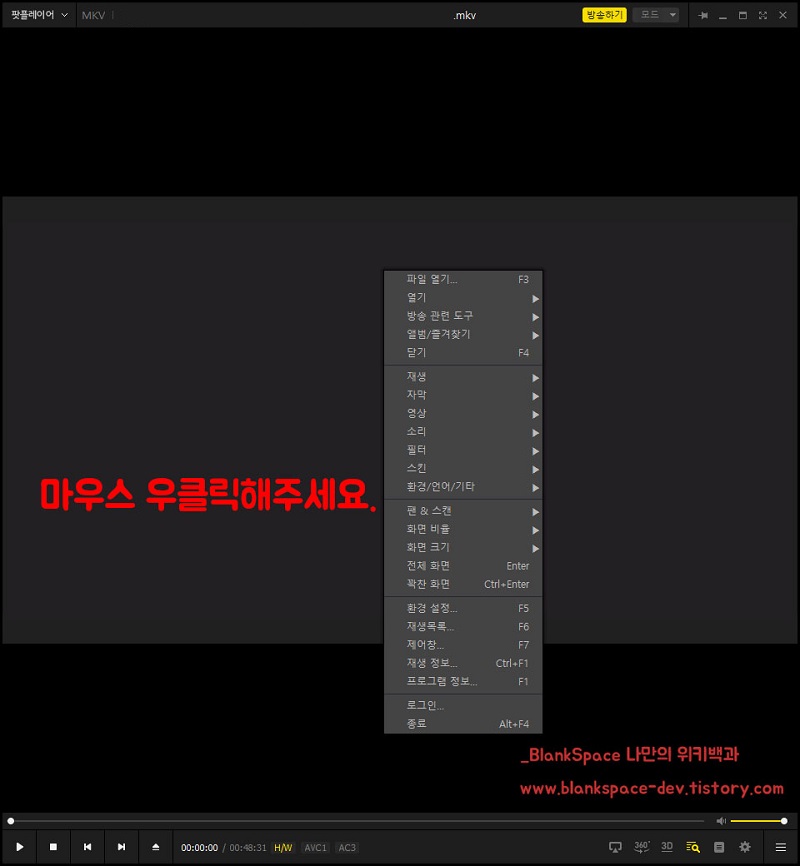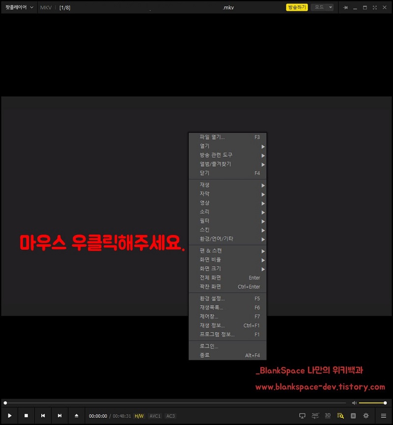 먼저, 영상을 재생해주세요. 재생되었다면, 마우스 오른쪽 클릭을 하여, 아래 이미지처럼 메뉴가 나오도록 해주세요.