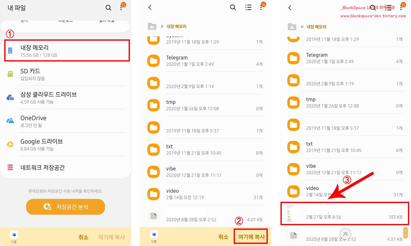 그럼, 스마트폰에 저장된 디렉터리나 파일들이 보일 거예요. 여기서 원하시는 위치로 이동하신 후, 아래 보이는 여기에 복사 부분을 누르시면 됩니다.