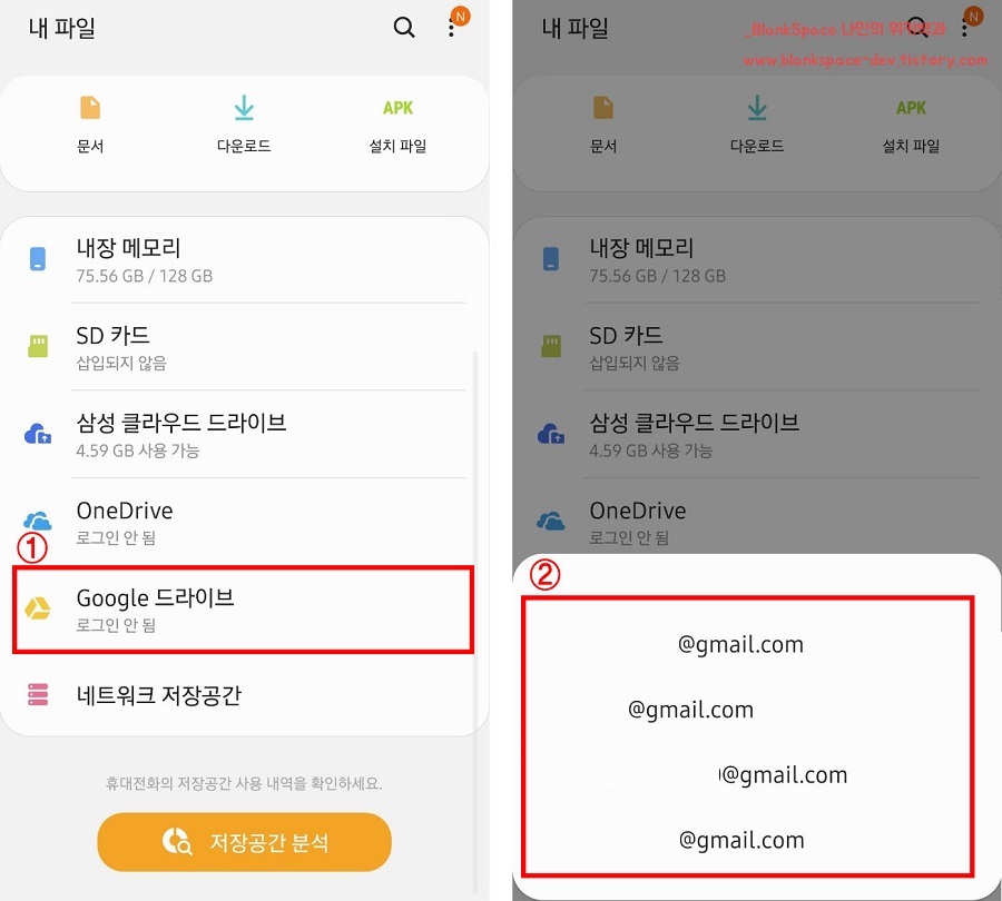 내 파일 앱을 실행하면, 아래처럼 여러 저장소가 있는 것을 확인할 수 있을 거예요. 이번 포스팅에서는 구글 드라이브를 이용할 것이니, 아래처럼 눌러주세요.