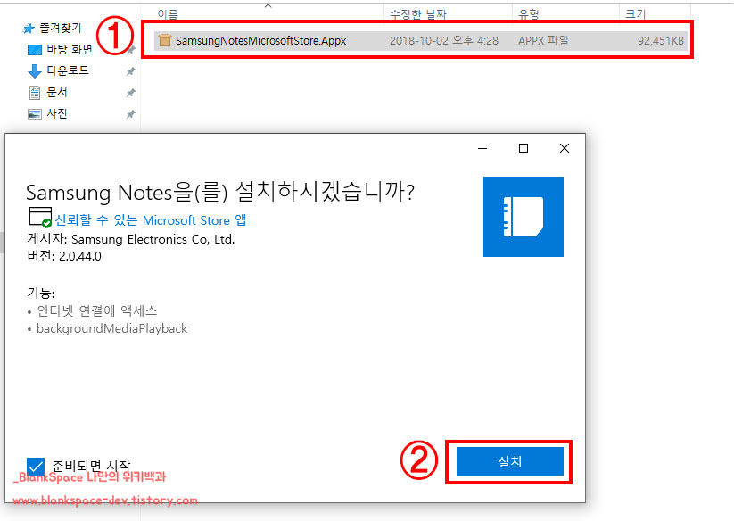 그럼, 아래처럼 Samsung Notes를 설치하겠냐는 창이 표시될 거예요. 순서대로 설치를 진행하시면 됩니다.